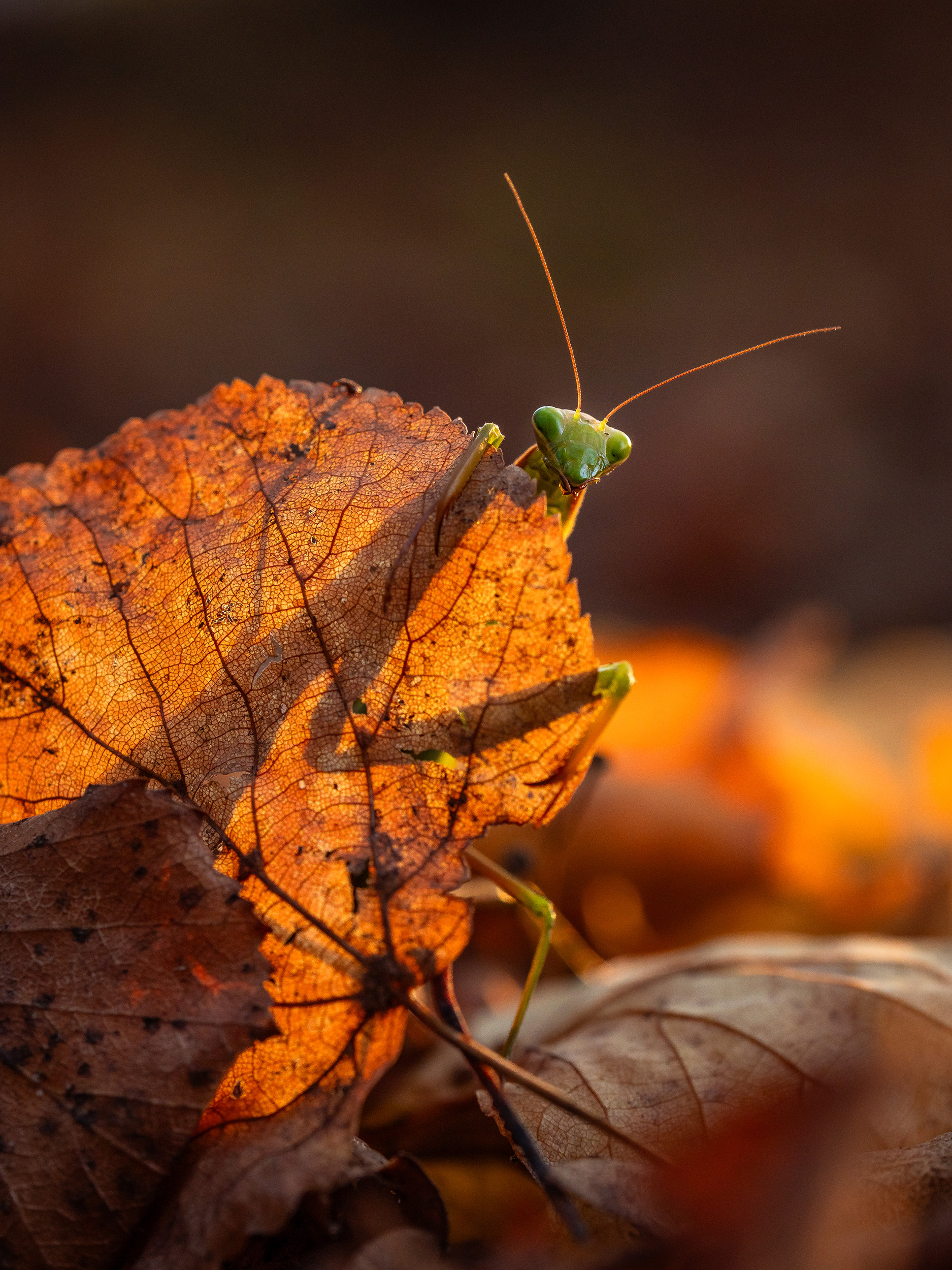 Tussen al die foto’s viel de foto van Iwona Wilk (@naturephotography.by.iwona) van een bidsprinkhaan die zich verstopt tussen gouden bladeren op door zowel de technische precisie als de originaliteit.