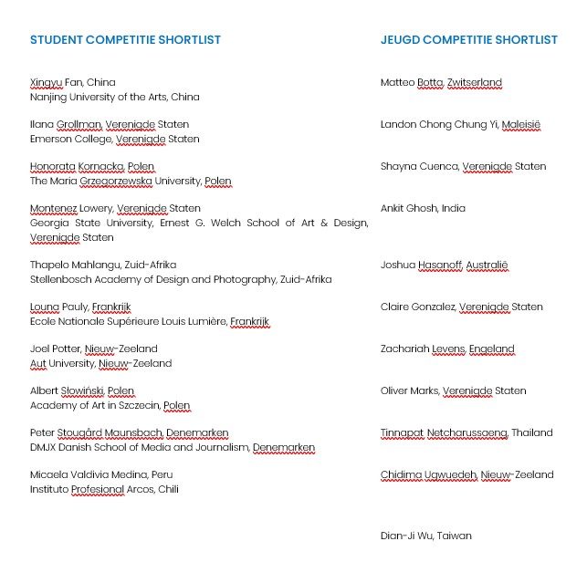 - Tien fotografiestudenten van toonaangevende universiteiten over de hele wereld zijn opgenomen in de shortlist van dit jaar, evenals 11 fotografen van 19 jaar en jonger
